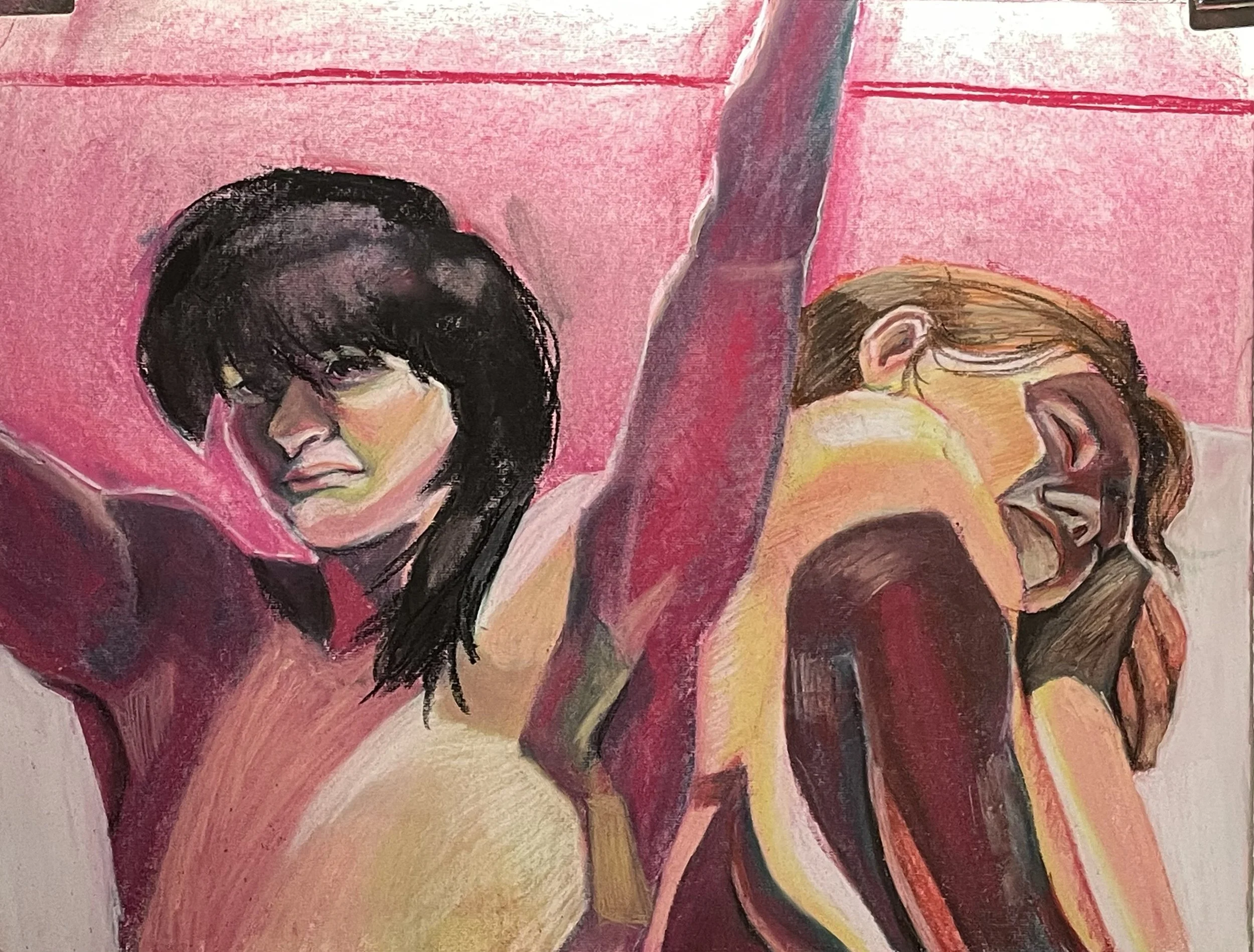 Drunk Tank is an exploration of color with a medium that I barely have touched on before, while sticking to what I like in art: figures, dynamic scenes, and uncomfortable moments that bring an unease to viewers. Using chalk pastels to practically match the skin towns while playing with vibrancy of colours and shadows, I use greens and reds to push and pull contrast on the two figures so that you can feel the surrealism of the pieces and how they lay together on the paper. A haunting composition with a vibrant background where it creates a parallel of beauty and fear. A vague composition to allow the viewers to make their own interpretation of the two figures and what their story is.