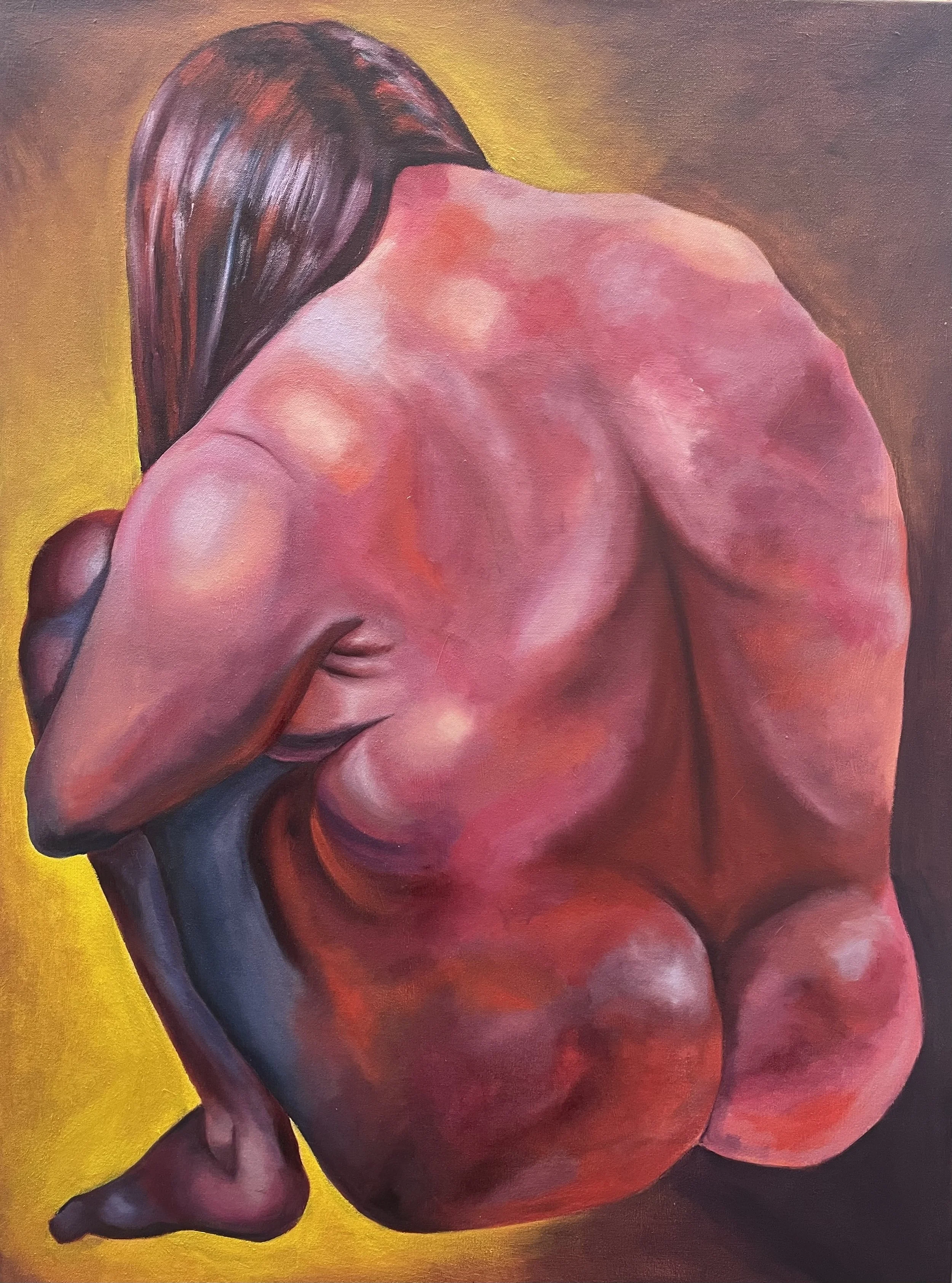 Lesbian of The Year is a painting of a female figure shoved into a composition that looks too small for her to sit in comfortably. She’s covered in lavenders and reds, lavender to represent the Lesbian inclusionary group Lavender Menace. This work is to talk about the uncomfortable and isolating feeling it is to be a lesbian growing up in a small rural town in a red state. Even in queer friend groups, I was the only lesbian which created a sense of uncomfortable unease, so I wanted to represent that within a painting.
